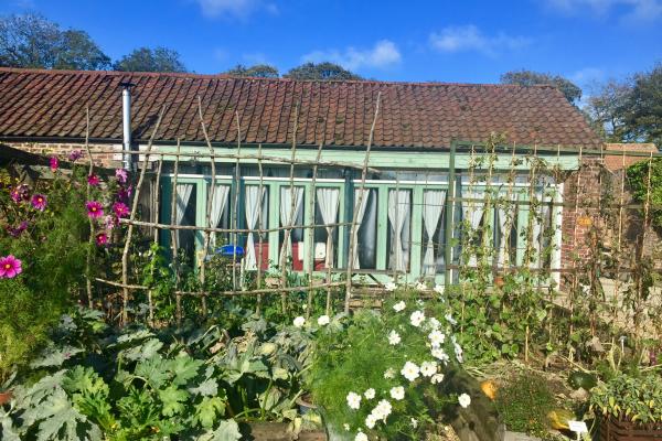 The summerhouse has brass double bed, a large open plan living and sleeping space with separate fully equipped kitchen and shower room. Huge log burner, towels and bed linen included, TV. Dog friendly. The summerhouse overlooks the kitchen garden and has outside seating.