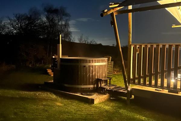 Outside your tent you have your own seating area, under canvass, so you can enjoy the outdoors even in the rain! Additionally you have another seating area around your very own solo stove - which doubles up as a fire pit and BBQ as well as wood fired hot tub for enjoying nights under the stars.