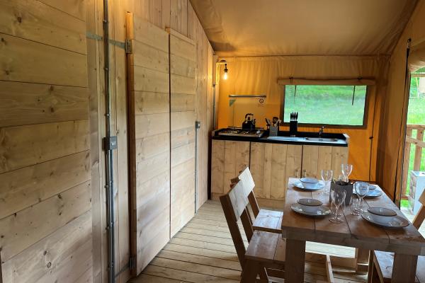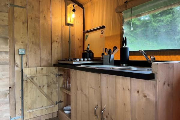 Each Safari Tent is well equipped with both indoor and outdoor facilities. Inside you will find a kitchen area, complete with gas hob and fridge; dining space for 4 and a sofa in front of the (bioethanol) fire for enjoying cosy nights in.