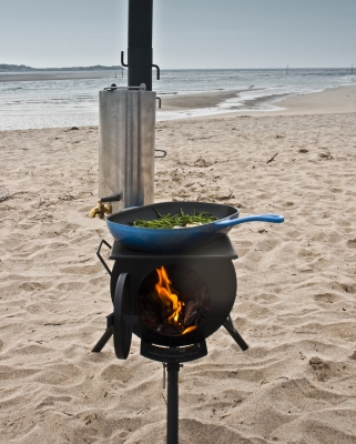 This wonderful piece of kit holds three litres of water and is finished in brushed stainless steel. It wraps snugly around the first flue section of the Frontier Stove and sits ontop of the hotplate. Once the water has boiled the Water Heater can simply be turned to one side of the hotplate and the water keeps warm from the flue. The tap at the bottom allows continuous access to hot water.